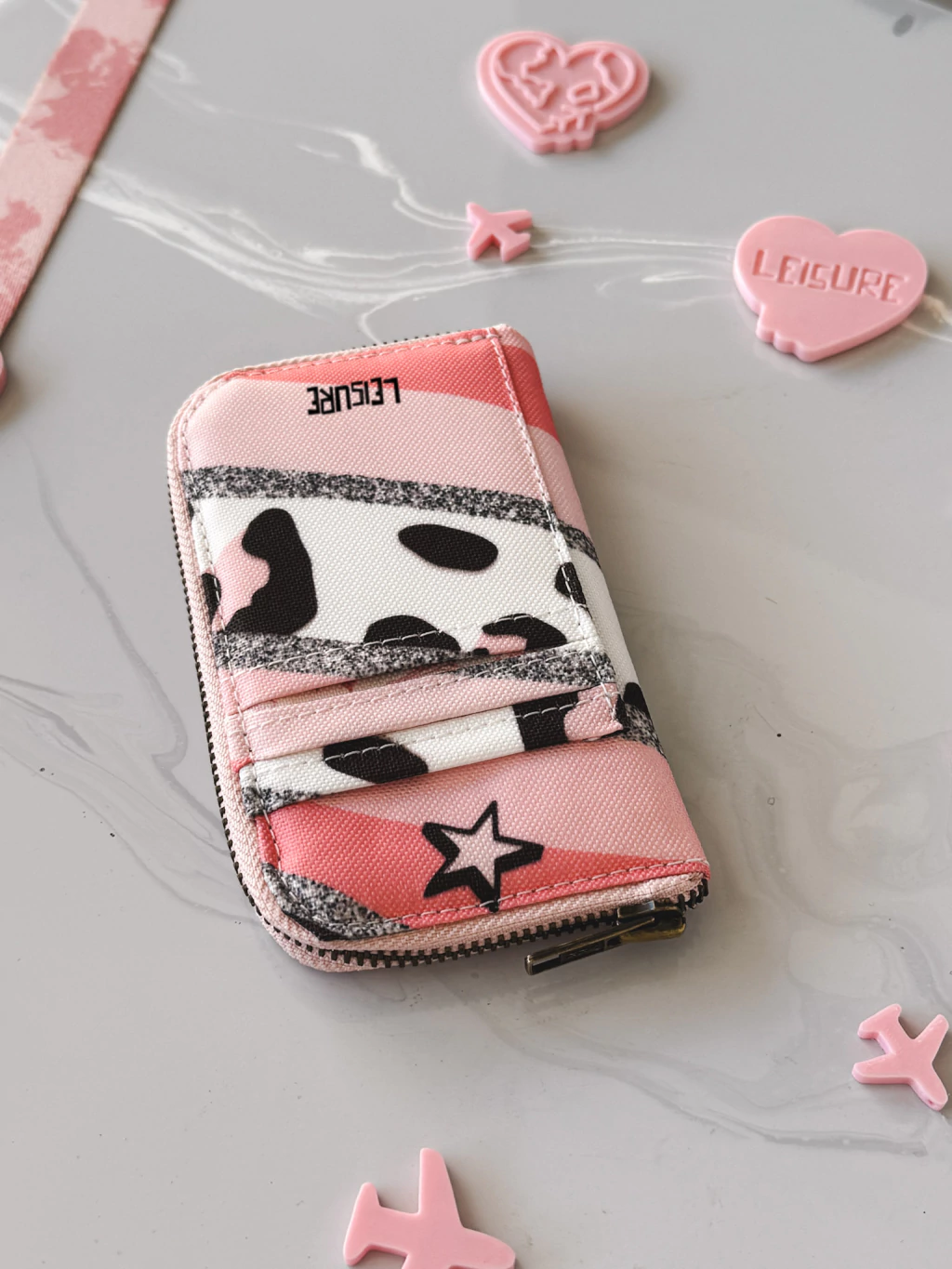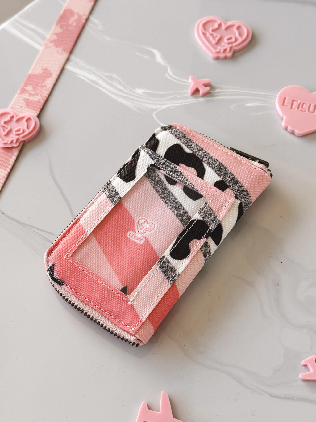 Al frente cuenta con 3 divisiones para guardado de tarjetas o documentos tales como DNI, licencia de conducir, carnet de la obra social, entre otro. En el dorso tiene un compartimento con cristal transparente. Posee cierre para guardar el dinero o papeles importantes dentro